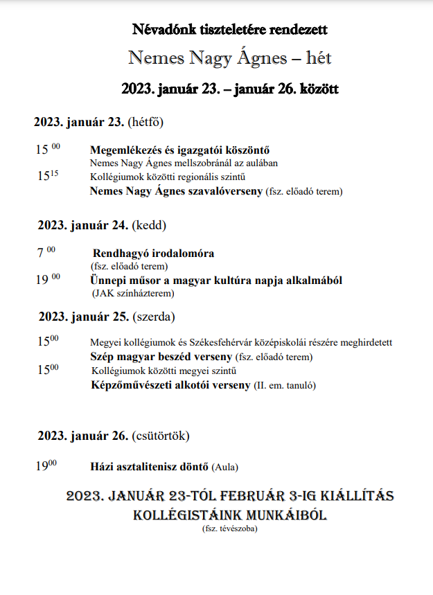 Hagyományainkhoz hűen, a magyar kultúra napjának alkalmából (1823. január 22-én tisztázta le Kölcsey Ferenc a magyar Himnusz kéziratát) színvonalas kulturális műsort adtak kollégistáink a József Attila Középiskolai Kollégium színháztermében. A programra sokan voltak kíváncsiak, a nézőtér zsúfolásig megtelt a fellépők barátaival, szoba- és csoporttársaival, mindkét kollégium vezetőivel és tanáraival. Tehetséges fuvolaművészünk, zongoristánk és énekes-zongoristánk előadása mellett hasonlóképpen lelkes tapssal jutalmazta a közönség a tánc, a szavalat és az ének előadóit is. Élvezettel hallgattuk a fiúkollégium lakóinak gitárszóló, illetve páros citerajátékát – a jelenlévők hangos ovációval kísért tapssal ismerték el a magas szintű népzenei előadást is. Köszönjük, hogy fiataljaink megmutatták tehetségüket, felejthetetlen estét szereztek valamennyi jelenlévőnek!