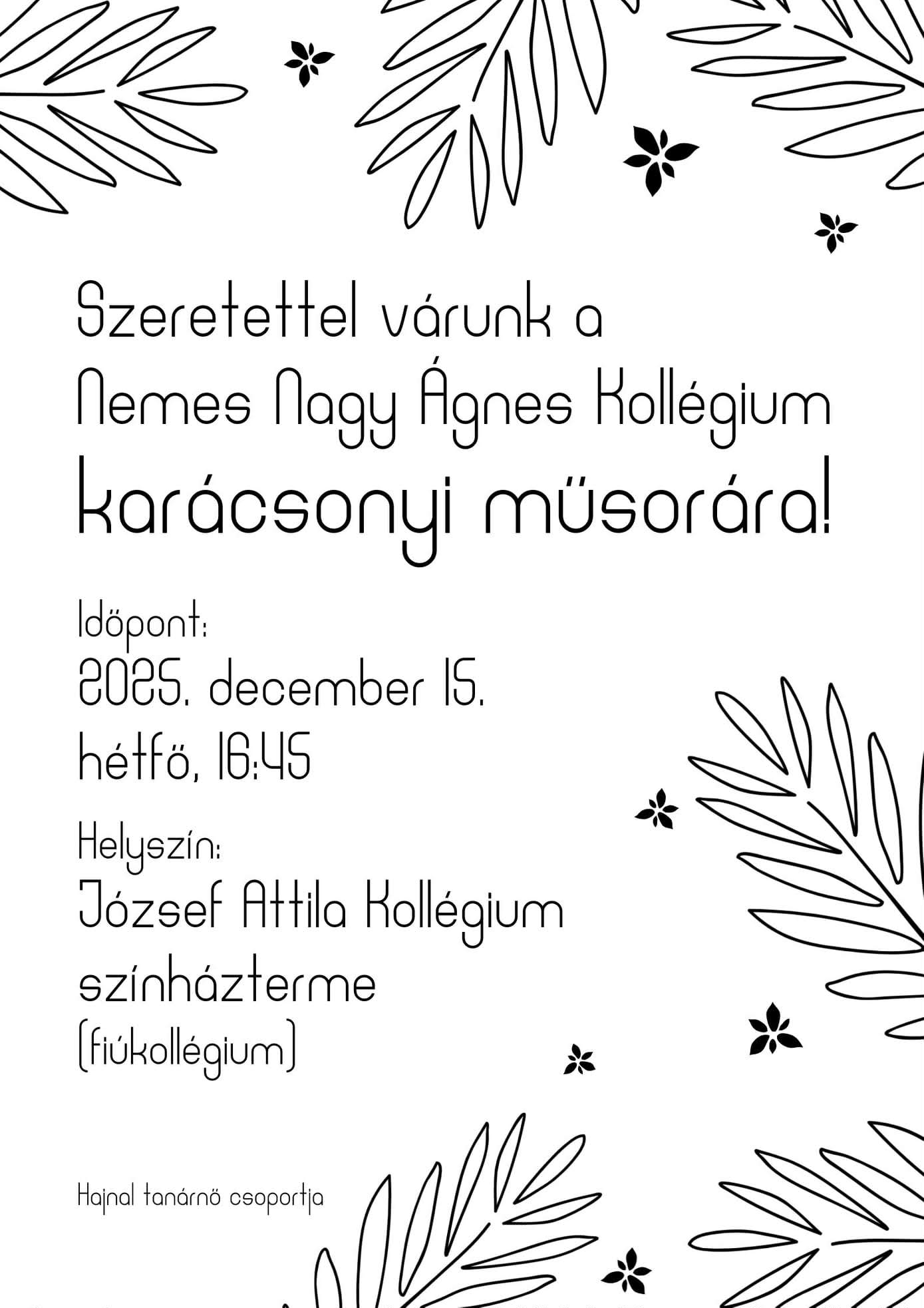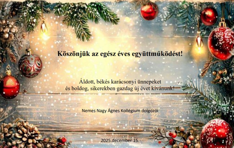 Az idei tanévben ugyan nem a régi, retro kollégiumi menzán ünnepelünk, hanem a fiúkollégium színházteremében, amelyet mi, a Nemes Nagy Ágnes Kollégium dolgozói, tanárai, diákjai töltöttünk meg karácsonyi hangulattal, a csodával, mély érzésekkel, ünnepi műsorral, értékes és emlékezetes pillanatokkal. A legfontosabb, hogy együtt voltunk karácsonykor is mindannyian, egy nagy kollégiumi közösségként ünnepelhettünk, majd pedig együtt vacsorázhattunk az ünnepi díszekbe öltöztetett Károly János utcai új étteremben.