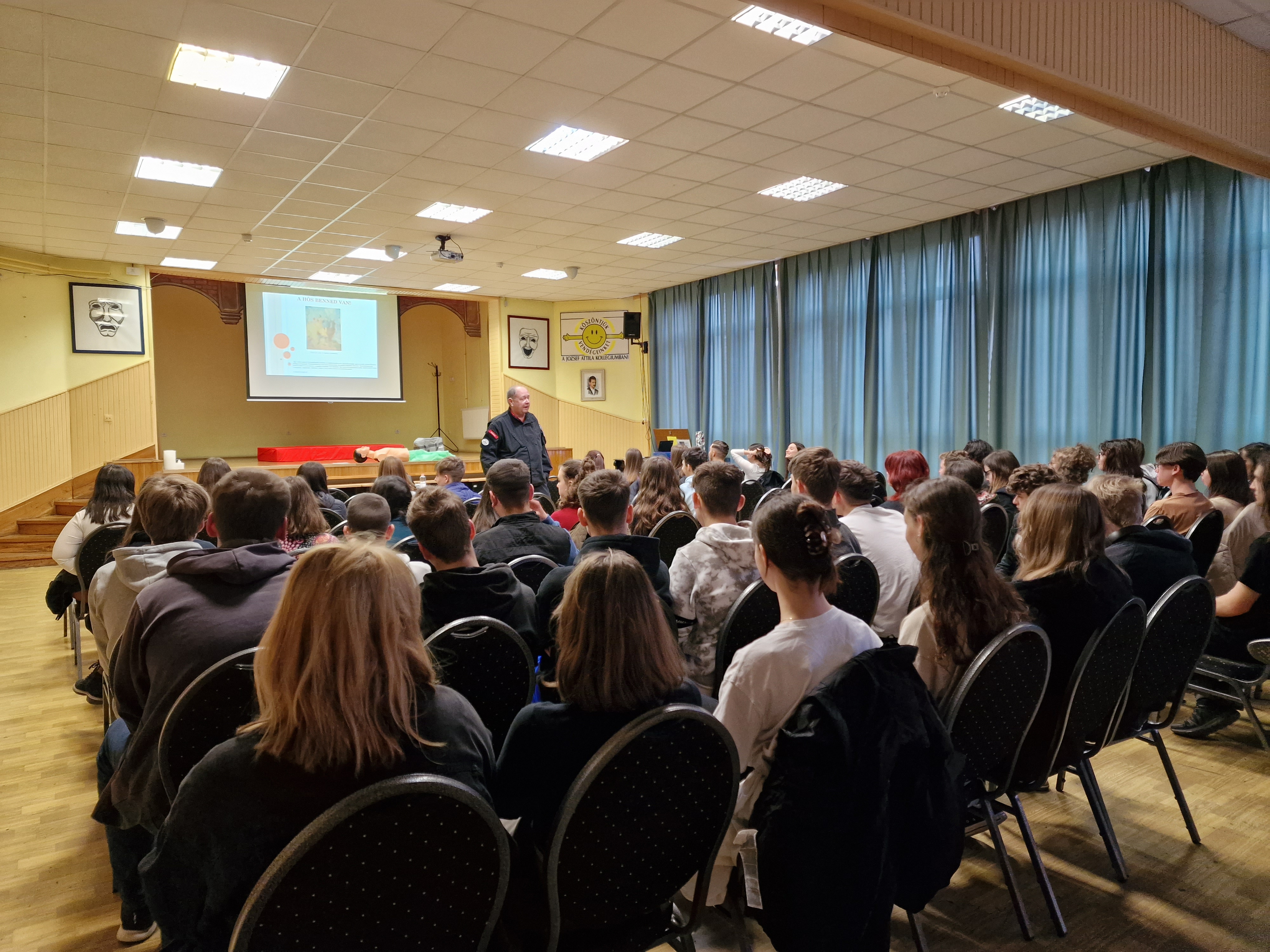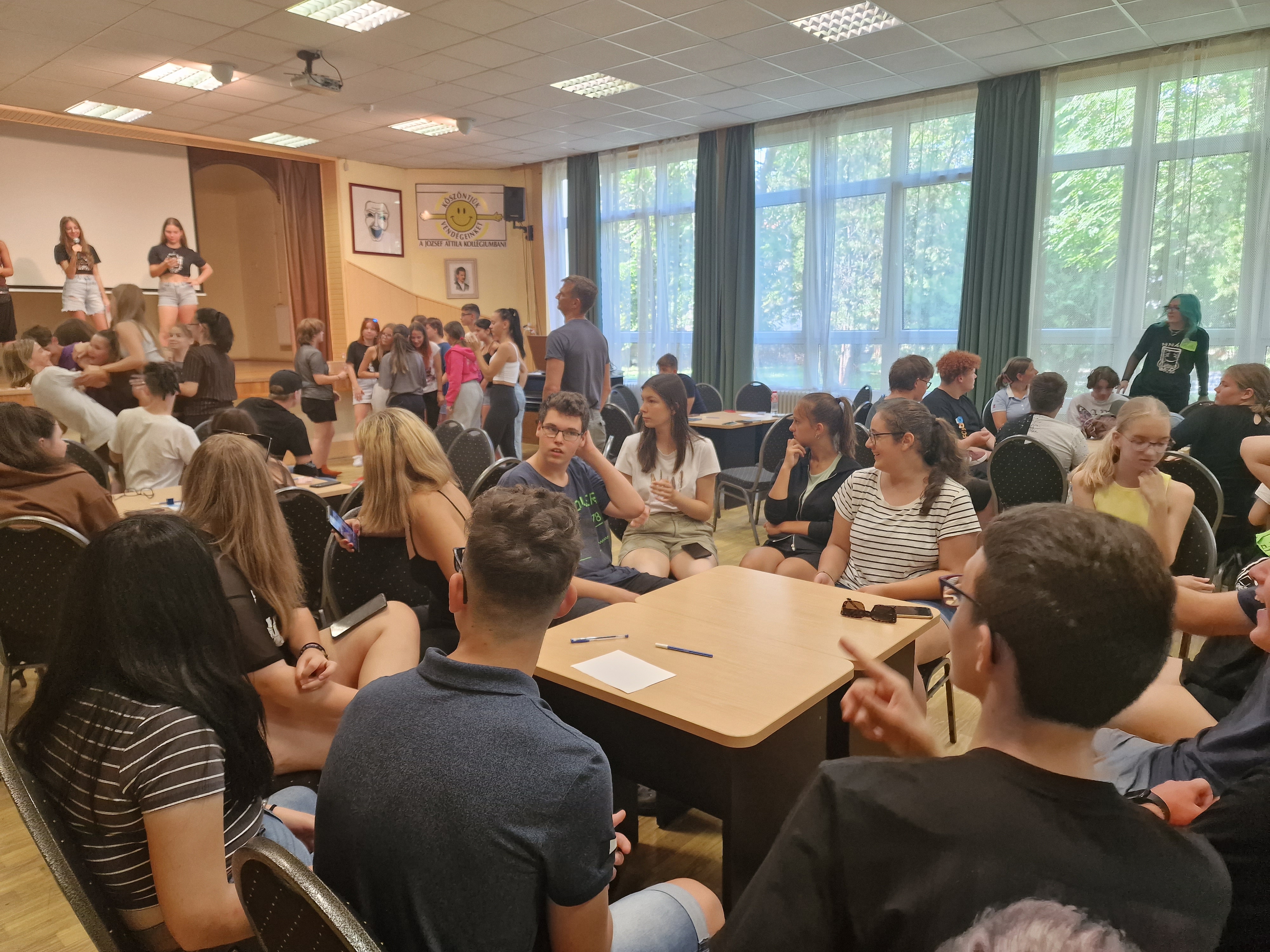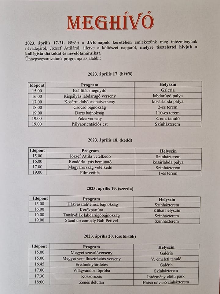 2023. augusztus 30-án indult a 2023-2024-es tanév a József Attila Középiskolai Kollégiumban. A dátum nem elírás, hiszen a kollégista diákok olyan speciális helyzetben vannak, hogy mindig az iskola megkezdése előtti napokban kell beköltözniük a kollégiumba. Kis gólyáink, vagyis a 9. osztályos tanulók két nappal az iskolakezdés előtt érkeznek, mert hagyományosan ezen a napon rendezi számukra a kollégium Diákönkormányzata a gólyanapot. A hivatalos elintéznivalók után a diákok búcsút vettek a szülőktől, hiszen a DÖK-ösök és a kollégium nevelőtanárai számos izgalmas programot készítettek elő számukra. És ez fordítva is igaz volt, csak arról tanáraink akkor még nem sejtettek semmit. :) Gólyáink az épületben való eligazodást segítő túrák után egy vidám hangulatú, játékos vetélkedővel egybekötött ismerkedési esten vettek részt. Az este még számos meglepetést tartogatott - főleg a nevelőtanároknak - hiszen volt olyan kis gólyánk, aki a teljes kulcscsomóját a szekrénybe rakta, a lakatkulccsal együtt, majd rápattintotta a lakatot. Semmi vész! Megoldottuk! :) Másnap délelőtt Székesfehérvárral és városunk nevezetességeivel ismerkedett kis gólyáink csapata. A délután folyamán pedig a lánykollégium gólyái is ellátogattak a JAK-ba, ahol fiú-lány vegyes gólyacsapatok mérték össze tudásukat és ismerkedtek egymással. A játékos vetélkedő végén Gólyakirálynőt és Gólyakirályt is választottak a fiatalok. Közben megérkeztek régi, szeretett diákjaink is. Nagy mosolygások, nagy újratalálkozások közepette elindult a 2023-2024-es tanév.