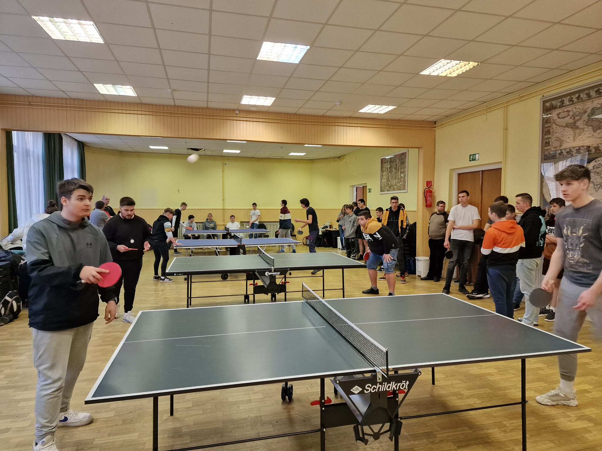 2023. február 20-án nagy volt a sürgés-forgás a kollégium aulájában. A sok vendég a Megyei kollégiumi asztalitenisz bajnokságra érkezett, ami az egyik legnépszerűbb rendezvényünk a megyei kollégiumok diáksága körében. A legjobb kollégista pingpongosok a megye hét intézményéből érkeztek nagy lelkesedéssel és felkészültséggel. A megmérettetésen képviseltette magát a dunaújvárosi Rudas és a Lorántffy kollégium, a velencei Entz kollégium és Székesfehérvár vonatkozásában mind a négy városi intézmény, azaz az Árpád, a Váci, a JAK és az NNÁK is. A résztvevők egyéni fiú, egyéni lány és vegyes páros felállásban mérhették össze tudásukat. A pingpong egy olyan nagy múltú játék, melynek gyökerei a 12. századig nyúlnak vissza, a 19. században terjedt el Európában és népszerűsége mind a mai napig töretlen. Ezt bizonyítja az a közel 50 fő résztvevő is, akik eljöttek hozzánk ezen a délutánon, és önfeledten vetették bele magukat az izgalmas játszmákba.