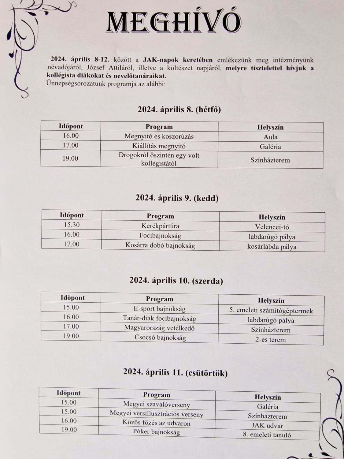2024. április 17-én rendezte meg hagyományos focitornáját az Árpád Kollégium a sportot és futballt kedvelő kollégisták számára. A regionális szintű megmérettetésen a középiskolai kollégiumok felkészült csapatai szépen szerepeltek. Az Árpád Kupa győztes csapata végül a JAK-os különítmény lett. A csapat tagjai: Adács Levente, Bordács Zoltán, Bulath Hilár, FarkasMarcell Milán, Kocsis Ákos, Pordán Alex, Soós Bence, Tóth Krisztián, Zvezdovics Gábor Bence. Torna legértékesebb játékosa: Bordács Zoltán. Gólkirály: Zvezdovics Gábor Bence (6 gól). Felkészítő tanár: Ötvös István. Szép volt fiúk! Gratulálunk!